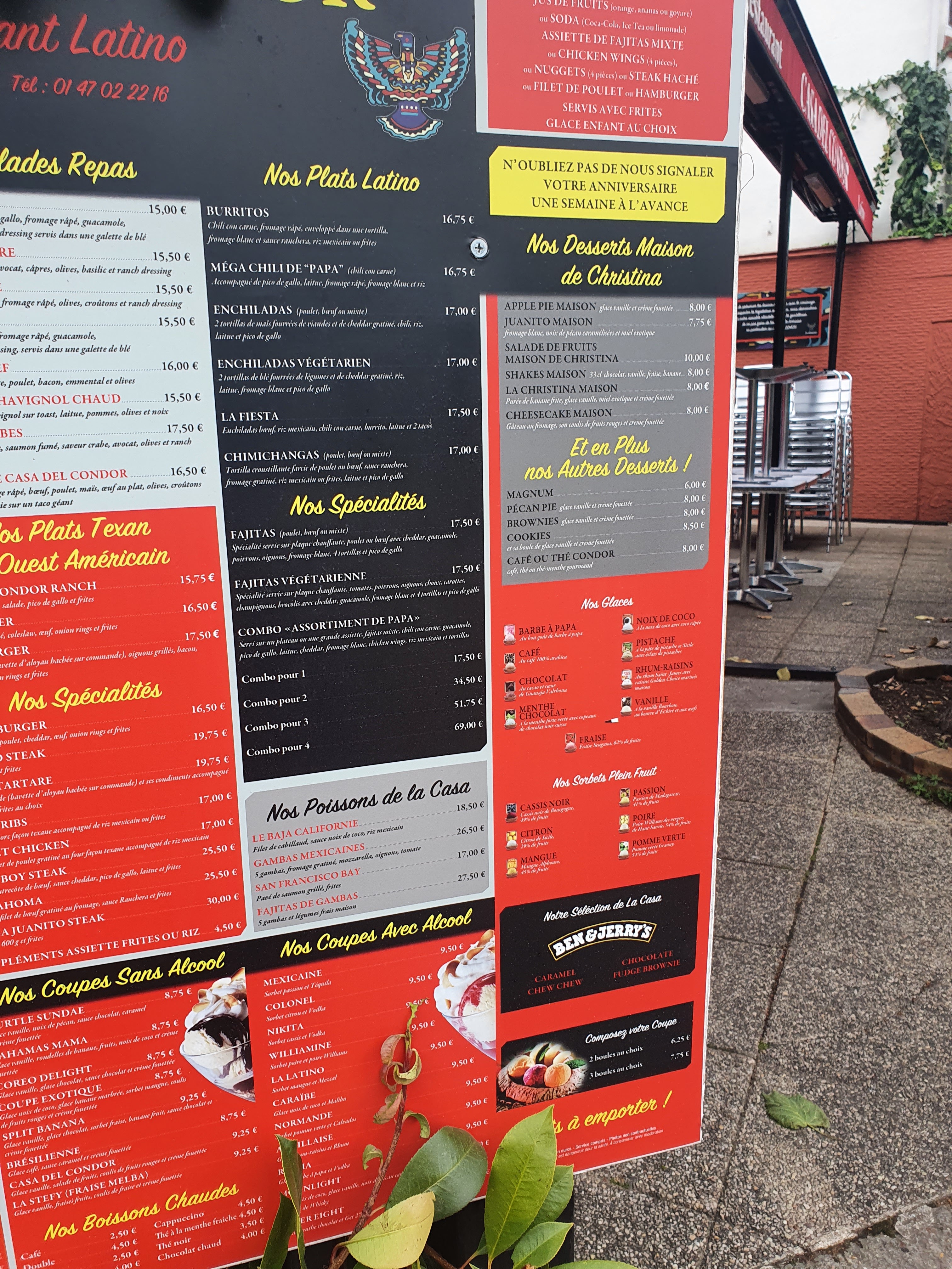 Petite terasse calme. Choix varié et plus qu appetissant. Nous avons passe un bon moment. Personnel gentil et rapide. Gestes barrieres respectés ! Nous avons testés : - plateau mixe. Delicieux. J ai particulierement bien aime la viande a fajitas mixe. - cocktail casa del condor delicieux mais s accord difficilement avec les plats. Mieux vaut s endormir - margarita : copieux a souhait - cheesecake
